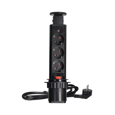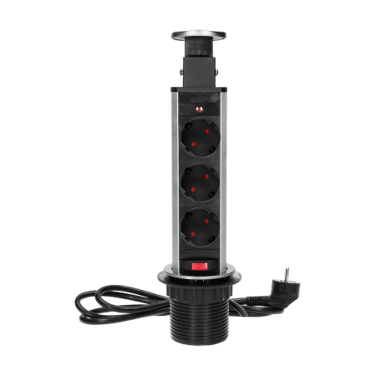 Priza retractabilă pentru birou cu diametrul de 6 cm, dotată cu sistem de blocare și cablu de 1,8 m, oferă o soluție elegantă și practică pentru alimentarea dispozitivelor electronice în spațiile de lucru. Aceasta este prevăzută cu trei prize Schuko (2P+E) cu împământare și obloane de siguranță, integrate într-o carcasă retractabilă.